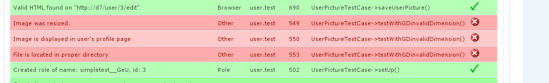 - Some of the upload user image tests are broken. I haven't looked at those in detail yet. This is maybe another issue or a misconfiguration/bug of gd because there are no php warnings reportet, in contrast to all other fails.
