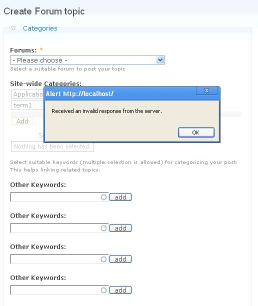 I enabled "Allow creation of new terms". When I use it with forum, after I select and type in a new term and click "create", I got this message: