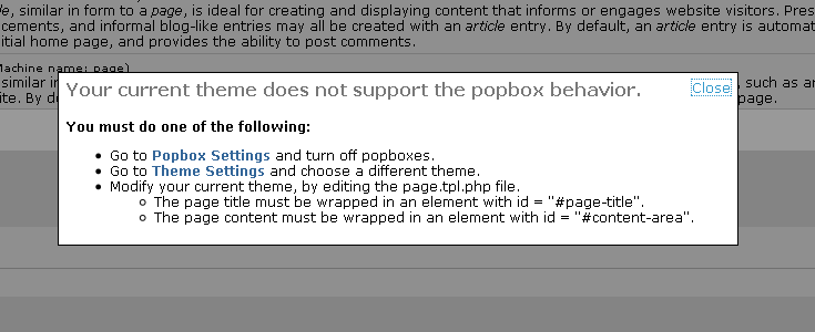 * I have been keeping half and eye on #299050: Help System - Master Patch, and, ironically, it looks like there is an emerging consensus to use the term "popup" to mean an old school popup window. In that case I will need to rename the functionality in this patch. There has already been a bunch of bikeshedding on this topic, but so it goes. I'd use "lightbox", but that might not be nice for the people maintaining the existing lightbox modules. So I am leaning towards a completely new term, like "ajaxbox".