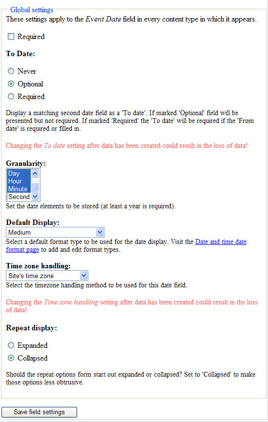 - Add new date field to Event called: Date (Type of date: Date, Form element: Text Field with Date Popup and Repeat Options.)