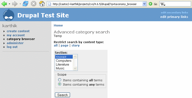 taxonomy_browser Think of this as a 'build your own category view' page. Users select the terms they want to see, and are redirected to the right URL (e.g. taxonomy/term/3,4,5), which displays the matching content.