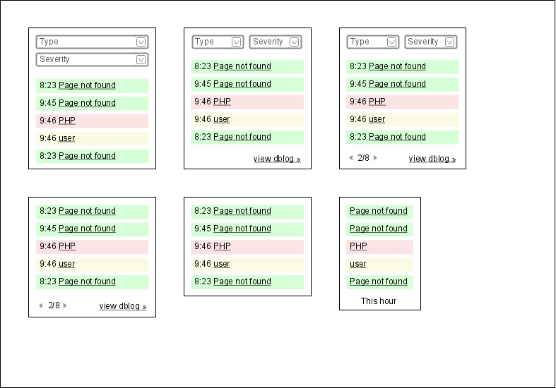 jody lynnThis is still a good feature request, but seems like mostly just a coding project. We just need a dblog_block to output a table of time, type, message and some configuration options for the types and severities and number to display.