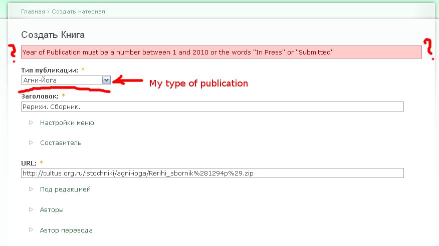keha3912 commentedI looked corrected errors in the -dev version and therefore decided to upgrade biblio.module. Yes, now a 'biblio_year' has become optional. However, this module automatically adds a column 'Submitted'. But I thought how can I fix this - I'm changed translation 'Submitted' - 'Не указан' ('Not specified').