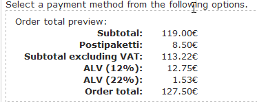 mitrpaka commentedShipping costs can be taxed correctly if shipping cost is entered without VAT as Ronald stated in the original post. However, there seems to be minor challenge in Checkout page as shipping cost in Calculate shipping cost section is shown without VAT (even though total is correct in payment method section).