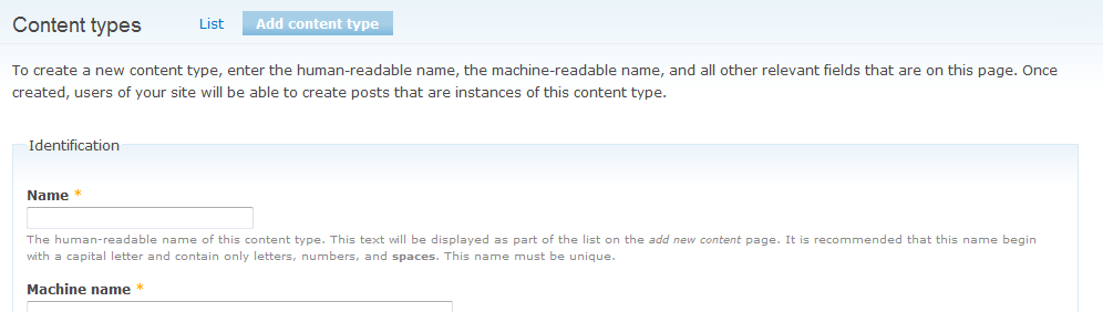 webchickHmm. I'm not so sure. I agree that the existing help text is next to useless, but content types are a very abstract concept in Drupal that people genuinely struggle with, and we could do with some explanation as to what they're actually creating in this form. "Name, machine name, etc" are not at all self-explanatory, unlike "Title" and "Body" on a piece of content. Furthermore, that observation about permissions sounds like exactly the kind of thing we ought to codify in help text, no?