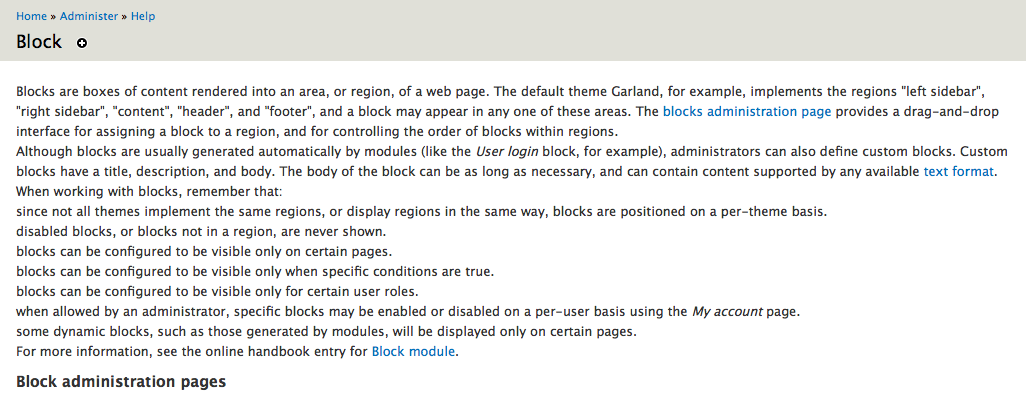 So. This represents a MAJOR change to the way this page was before. I think it's a change for the better. However... If we do this here, we need to do it everywhere, both in core, and also in contributed modules. Otherwise, our help pages get totally inconsistent from module to module and that's really bad for user experience.