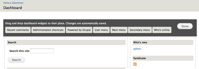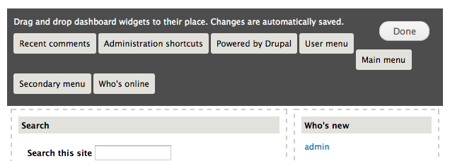 Now obviously, this implementation of the dashboard relies heavily on blocks, so it does not support displaying or dragging arbitrary objects on the page. Given that blocks are core's way of managing page regions and implemented by tons of modules, it doesn't seem outlandish to limit it to that - and that's the direction the issue has been going in for a couple months now. Whether it could be made more flexible via some last minute work (assuming there are people willing to do that) seems hard to say, but the module is pretty small and really only has a couple places where things happen: