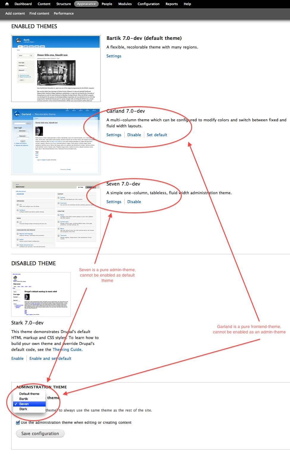 Plus a screenshot of the *new* /admin/appearance when garland is defined as a front-end theme (can't be selected as admin theme) and Seven is defined as an admin theme (can't be set as default).