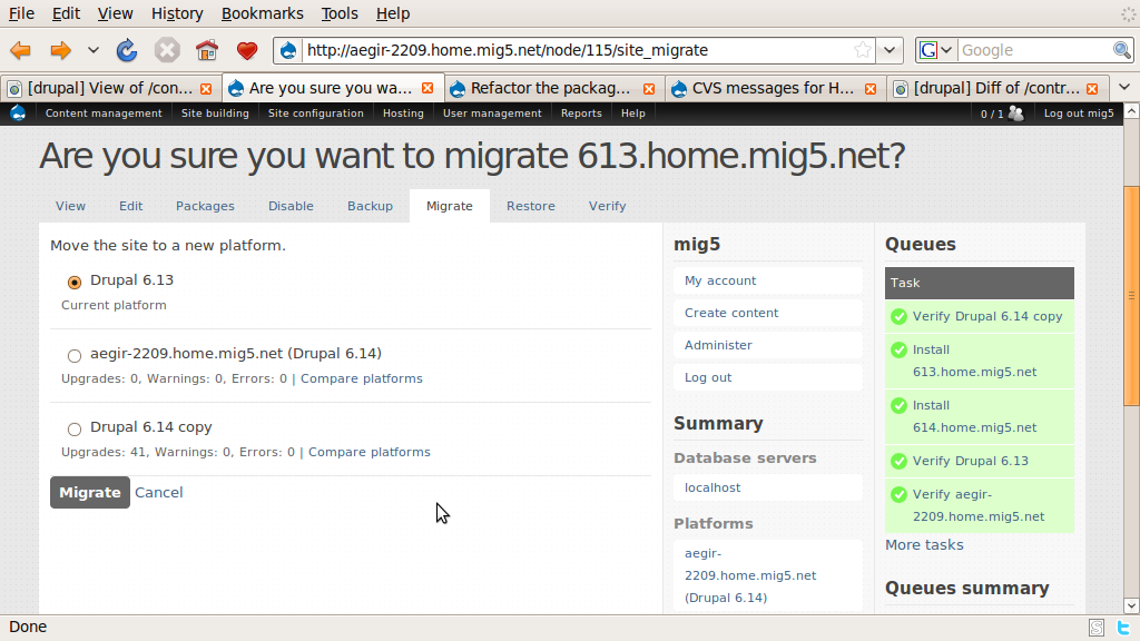 1) WIth a site provisioned on 6.13, and two 6.14 platforms (one that the main aegir site is on, and another just a fresh 6.14 downloaded), the migrate form shows the '41 upgrades' involved if the site was to migrate to 'Drupal 6.14 copy' but shows 0 upgrades (and 0 errors) for the Drupal 6.14 platform that the main aegir site resides in.