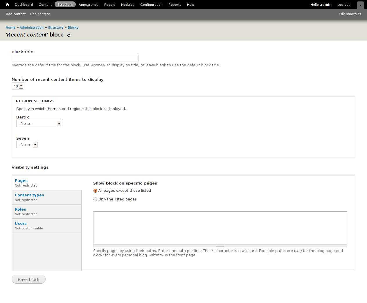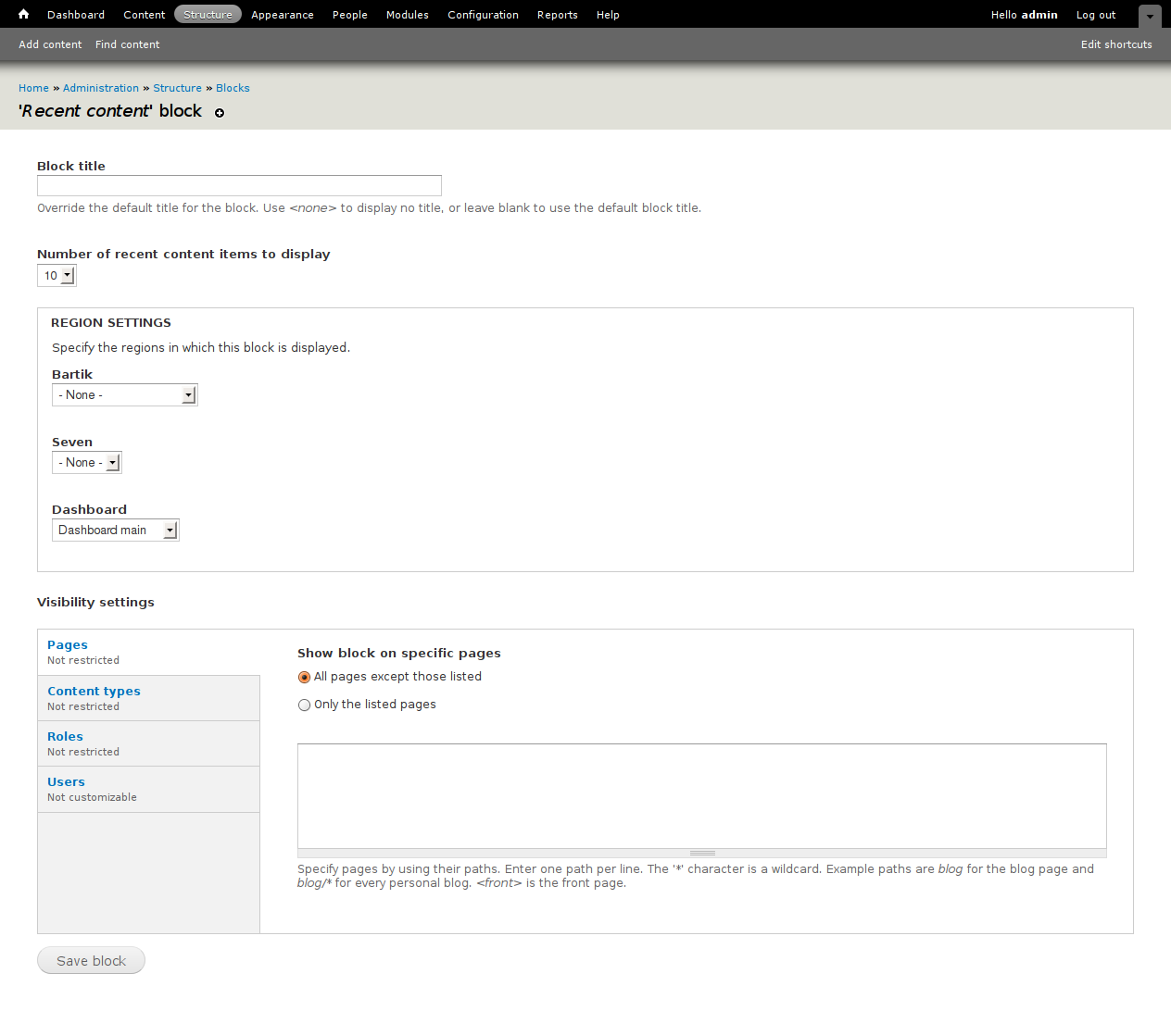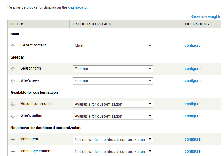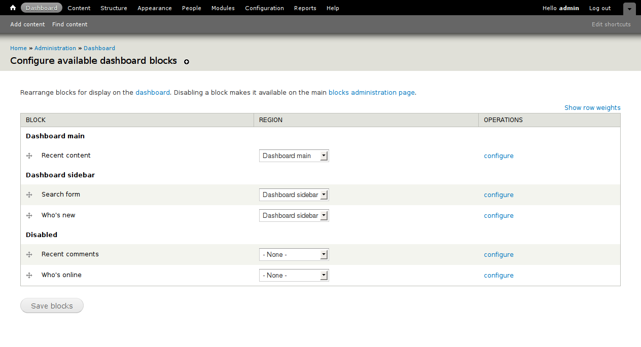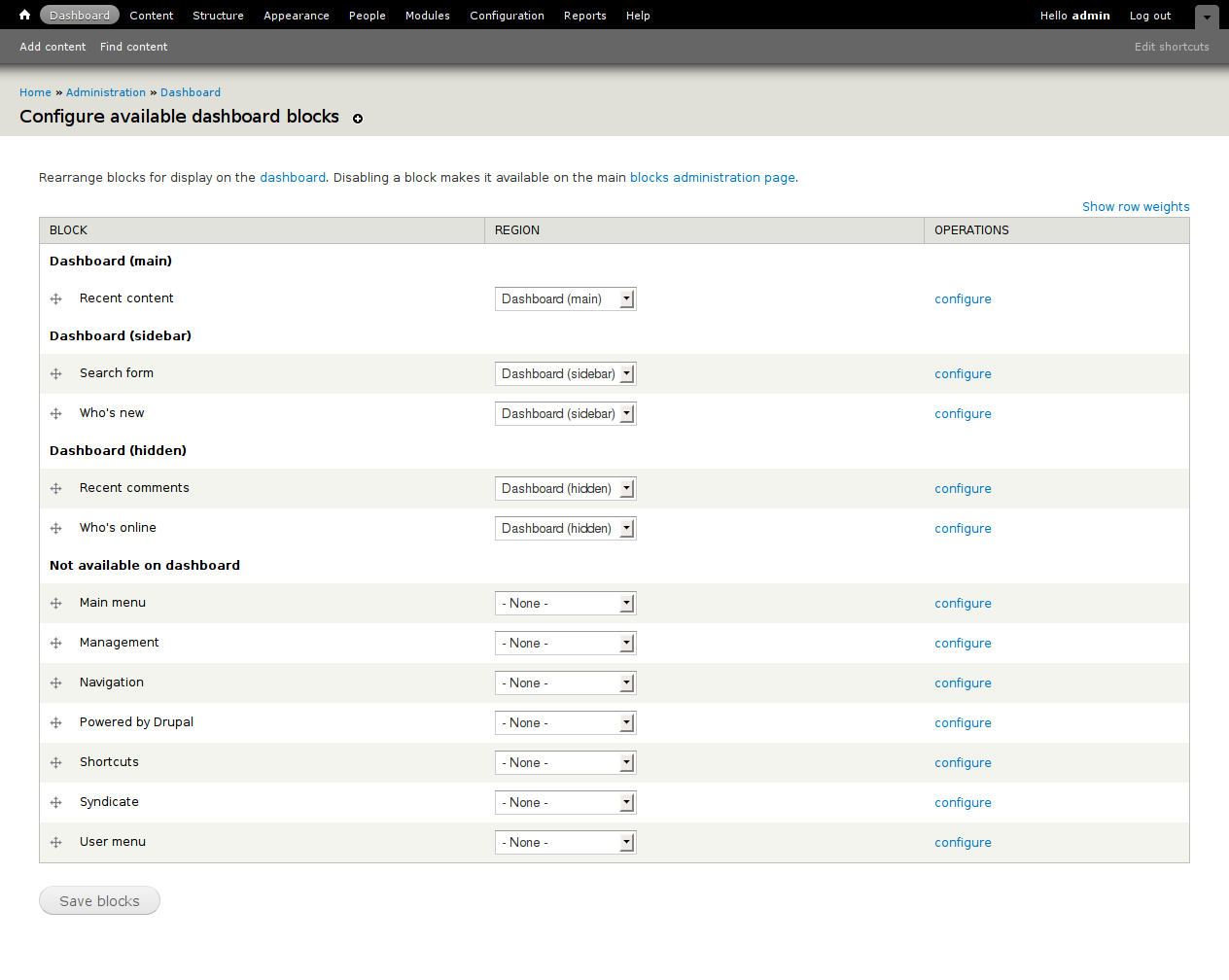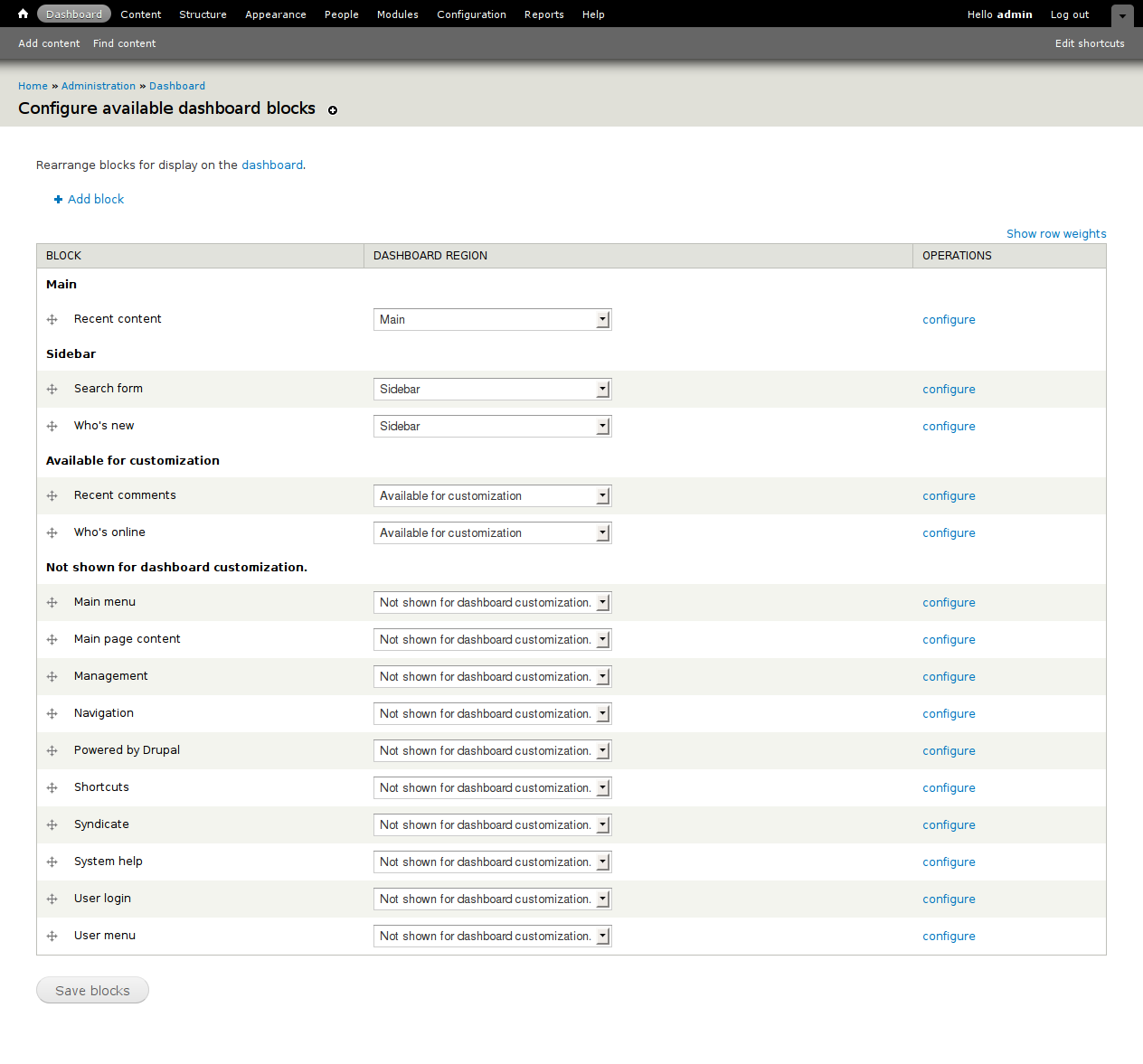 'category' => 'administrative'- then we open up the possibility for contrib to define additional categories and use them in various (potentially-horrendous) ways, but we don't actually encourage it because the Dashboard module would by default only care about blocks in the 'administrative' category.Regarding the UI, which is (almost) an entirely separate issue, I think a separate page with per-category checkboxes would work but perhaps be a bit nonintuitive to use? I'd like to hear why or if a separate region is a bad idea, because it really seems like the simplest and most intuitive to me. Note that of course we don't have to make it look like a totally separate region - presumably with some extra form_alter() magic in the dashboard module the blocks administration page could be arranged something like this?