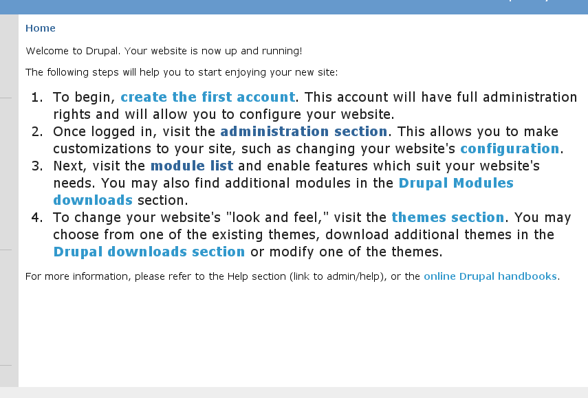 Welcome to Drupal. Your site is now up and running!