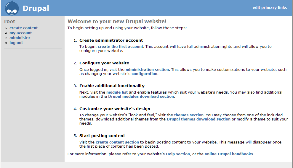 "Finally, click the [create content] link to start posting to your website. This message will disappear once the first content has been published and promoted to the frontpage."
