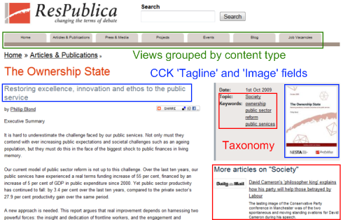 The site revolves around several key content types, created using CCK: Articles, Publications, Blog Posts, Press Releases, Media Comments, Videos, Projects, Events, People and Job Vacancies. Many of these are associated with a particular view (and several view displays) created using Views 2, with additional displays being created to allow for different sorting methods. Taxonomy vocabularies were created to allow for both categorisation and tagging of all content. This allowed us to place blocks in the sidebar promoting related content, and to create views that allow browsing of content by both category and type.