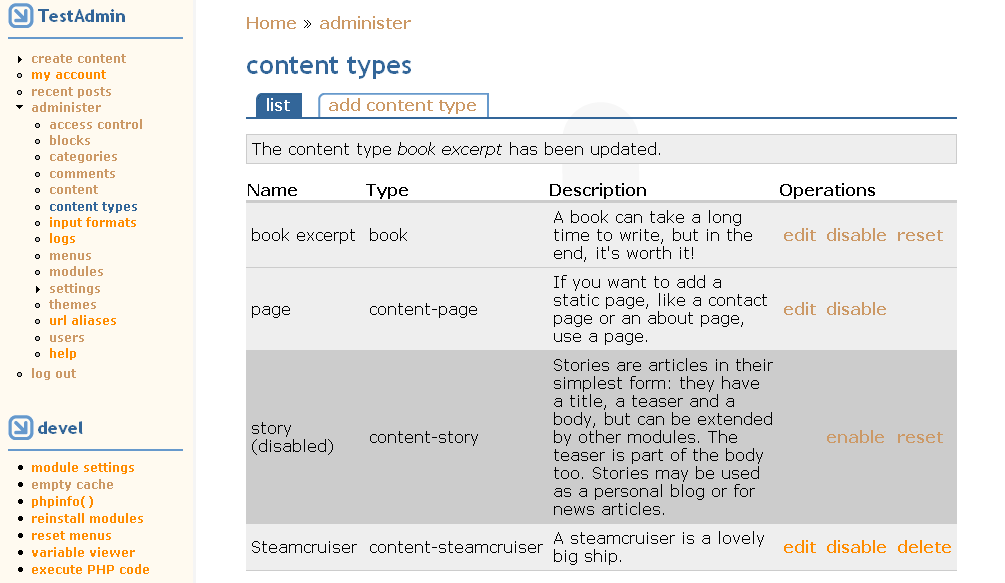 eaton commentedJust did a quick run through; all those things seem to be working well. The only thing I noticed was that the 'delete content type' form button does nothing, just returns to the list of content types and says 'The content type was updated.'