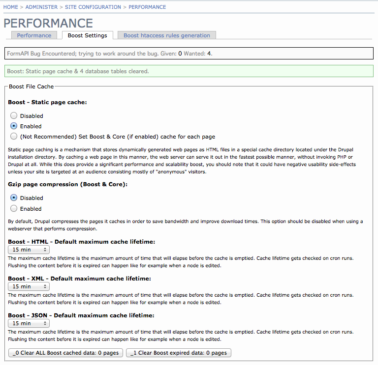 superflyman commentedWhen running Clear Boost's Database & File Cache, the system hangs for a while and then comes back with 'FormAPI Bug Encountered; trying to work around the bug. Given: 0 Wanted: 4.' I am using 6.19. Is there any way around this? Does the Dev version solve this problem? I see this was closed but I'm still having this problem with 6.x 1.18. We desperately need to clear out all of the database records and CSS and would like to keep using this module. Any help appreciated. Thanks!