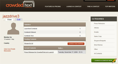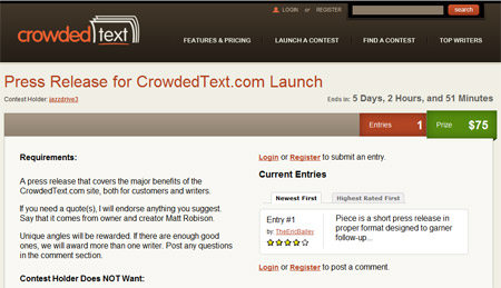 CrowdedText.com is a site where businesses and other customers can create writing contests for their creative and content needs. Writers then compete in these contests, uploading their entries, and getting paid if selected as a winner.