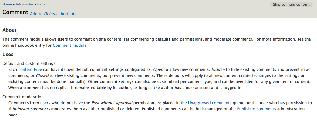 1. I think that "For more information, see the online handbook entry for Comment module." should go at the bottom of the page to be more consistent with the other help pages. For comparison, look at the Filter or Taxonomy help pages.