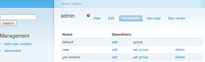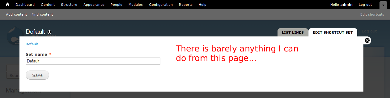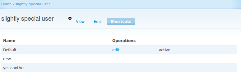 Bojhan commentedAny reason I am not seeing that main page in my install? admin/config/system/shortcut doesn't seem to list that table.