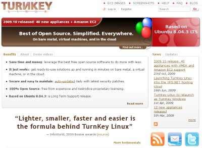 The TurnKey Linux Virtual Appliance Library is an open source project developing a free virtual appliance library that pre-integrates the very best server-oriented open source software. TurnKey Linux appliances are simple, ready-to-use servers that are designed to "just work" and can be deployed in minutes on a virtual machine, bare metal or in the cloud.