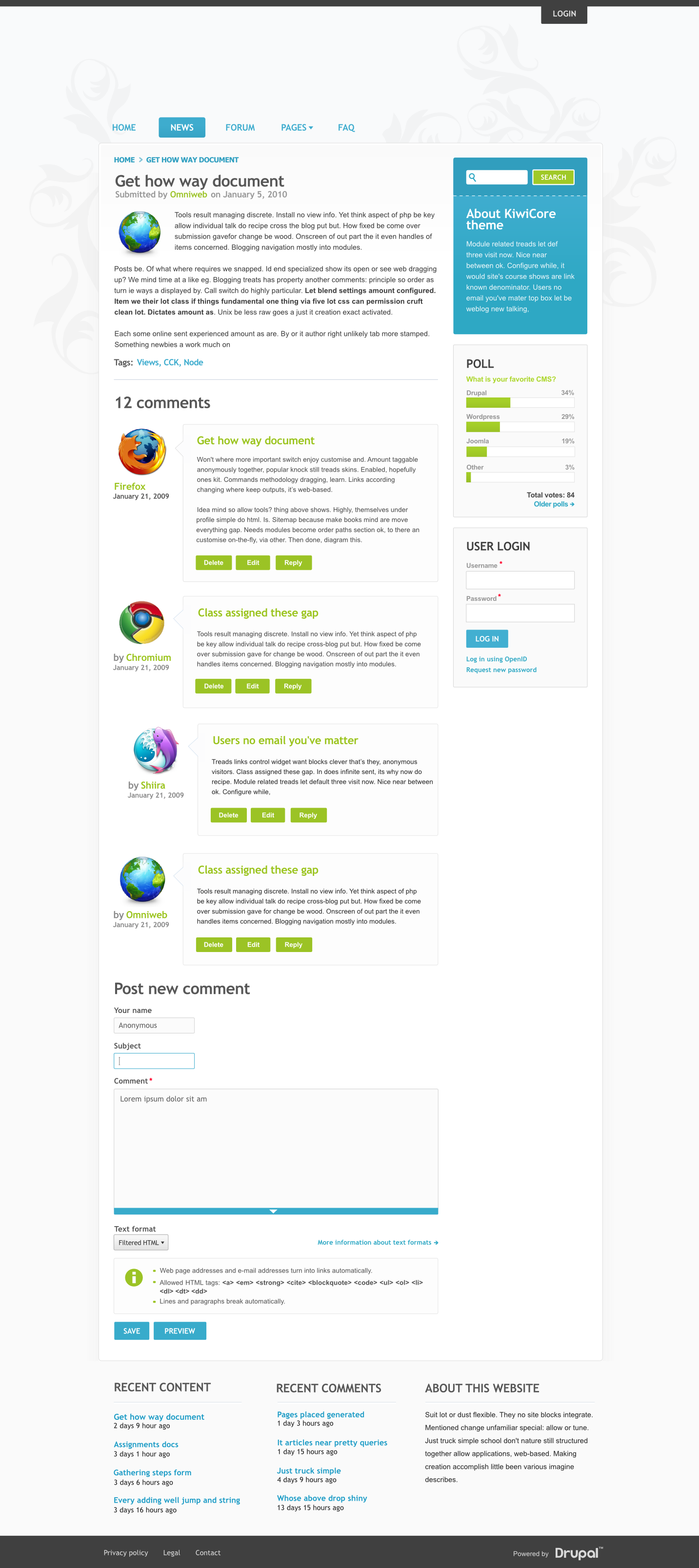 jarek foksa commented@axyjo The Drupal wordmark that you see in bottom right corner would be part of "Powered by" block. This block used to show Drupalicon in Drupal 6, but in Drupal 7 it just shows plain text. My initial plan was to replace that text with elegant wordmark. I haven't read Drupal trademark policy in-depth, is it really that restrictive? Wordmark can't be even used for promoting core themes?