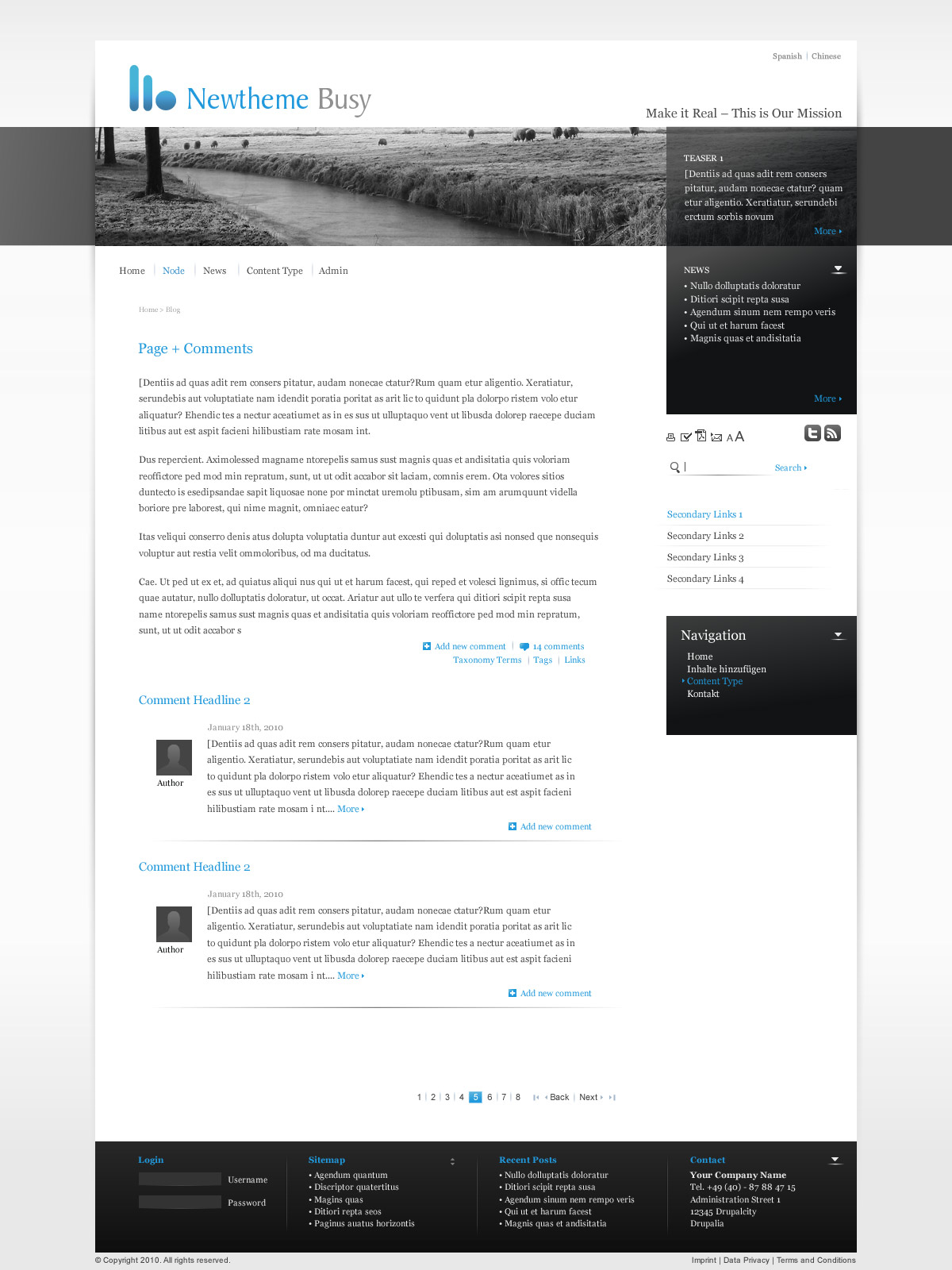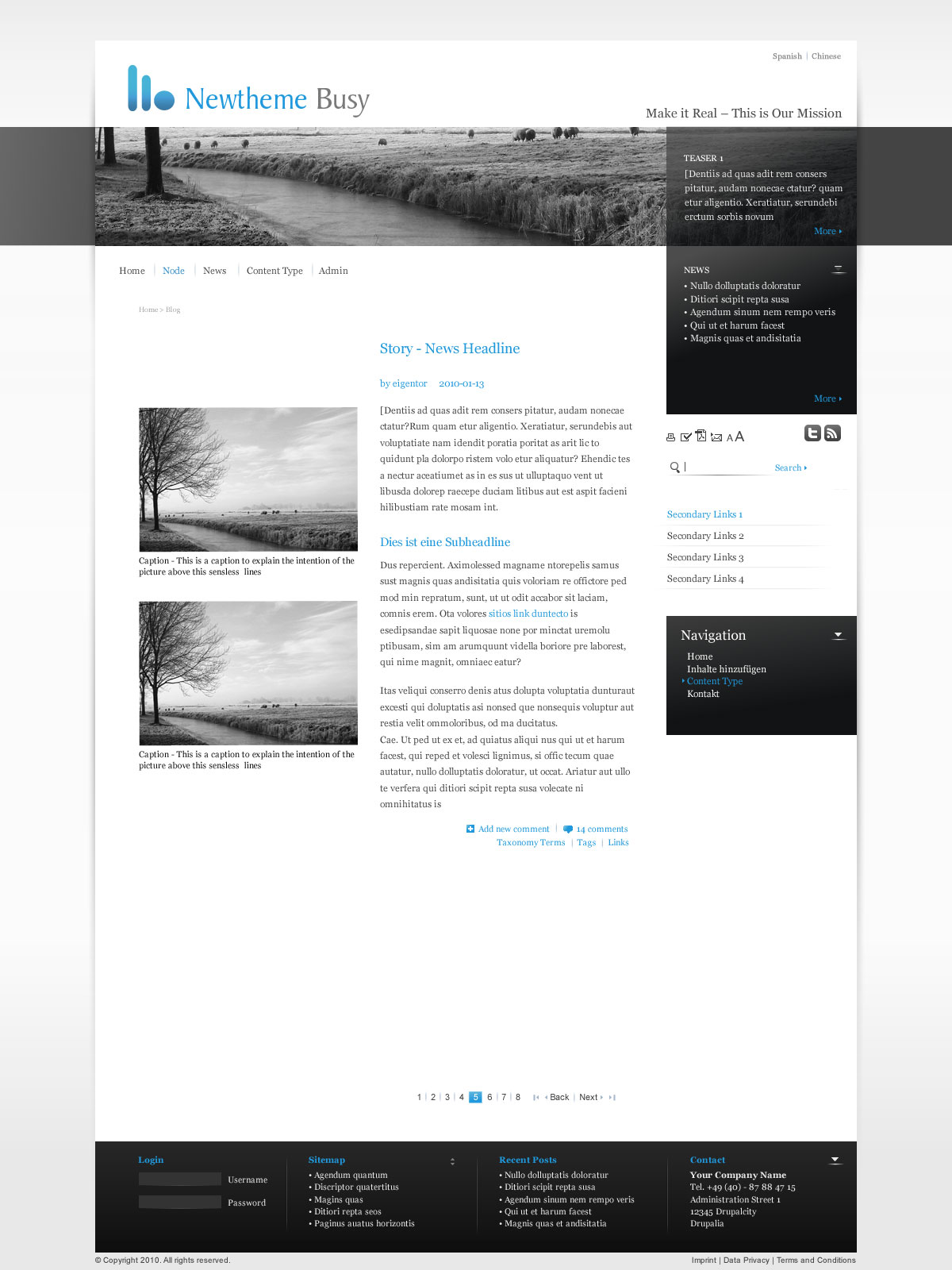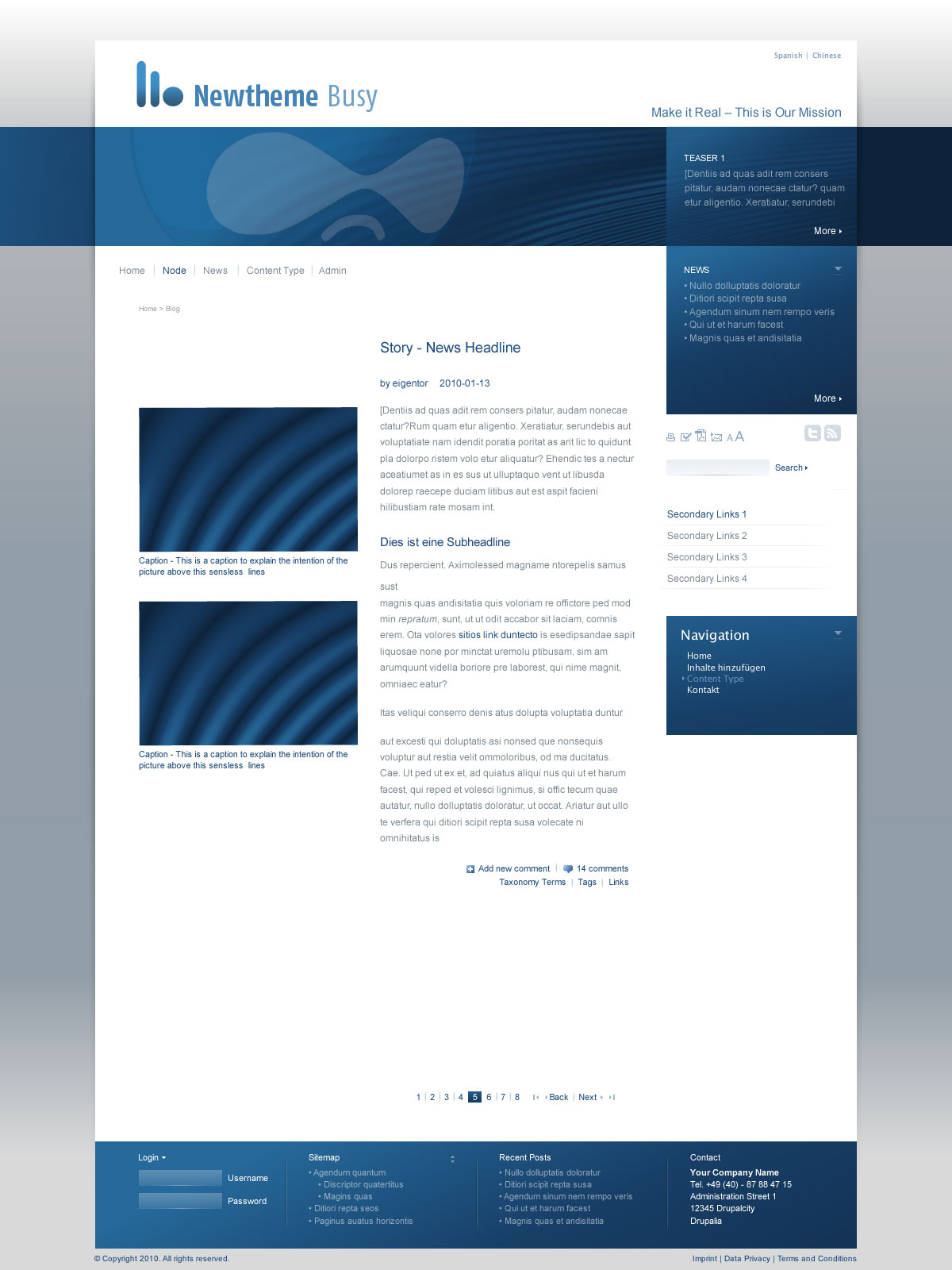 Meet "Busy" a theme that is targeted at corporate websites. The design is done by Jörg Blüge of X1 Corporate Design in Hamburg. We started out with the blackish blue colored version, that outlines the structure of blocks, Elements, typography a.s.o. There is more screens than those uploaded here and all core stuff is styled, like comments article images, node links, pagers a.s.o. There is a block section dividing the horizontal width by four (see footer) and also a block section dividing it by three (not in screenshots right now). There is a high header, and a flatter one. The high version is for the start page (or people that like it everywhere :) ). Flexible height of header may be a theme setting.