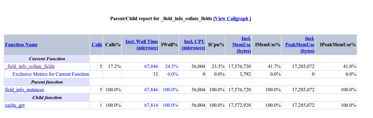 At 400 fields+instances, which I hope never to see in the wild but wouldn't be impossible on some kind of ecommerce or library database, we're looking at 47% inclusive CPU and memory usage, moving the caching reduces the CPU to 10% and memory to 20% (probably more of a gain with something like memcache which doesn't need to unserialize the array).