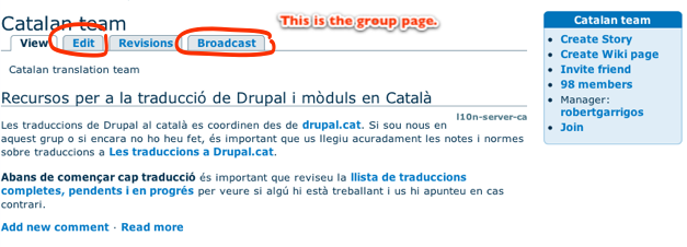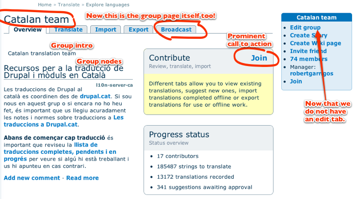 After patch, the group is the overview page's main content supplier. It also has a broadcast tab. Because a direct edit tab here would be confusin, the edit group link is on the group block. The Join action is also made much more prominent, and the contribution block less tall due to no need for the cross linking anymore.