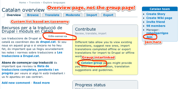 The first is somewhat connected to the second (there is a group block + a link to the group in the contribution block). The second is however not at all connected to the first. There is no way to navigate back. However, ideally, these two interfaces would be tightly coupled and presented as one. The user should not be bothered with the fact that we have OG and we have l10n_server and these two are different things.