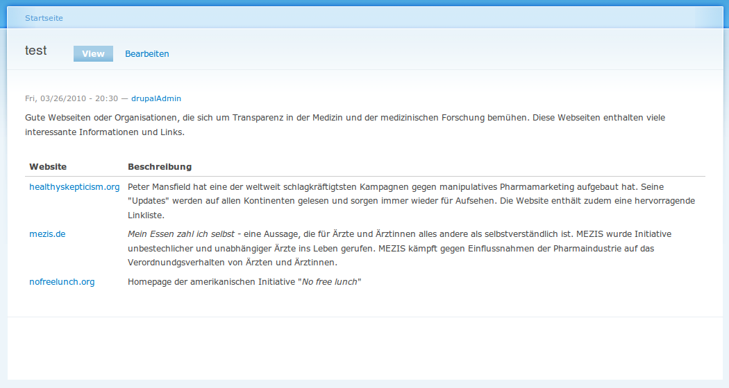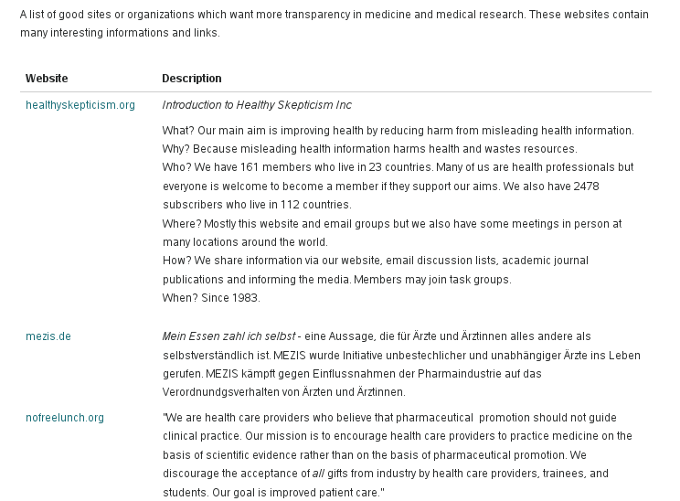 <p>=de=Gute Webseiten oder Organisationen, die sich um Transparenz in der Medizin und der medizinischen Forschung bemühen. Diese Webseiten enthalten viele interessante Informationen und Links.=es=Una lista de sitios en la red y organizaciones que pretenden una mayor transparencia en la práctica de la Medicina y en la investigación médica. Estas páginas web contienen muchas informaciones y muchos enlaces de interés.=qz=A list of good sites or organizations which want more transparency in medicine and medical research. These websites contain many interesting informations and links.=qq=</p>