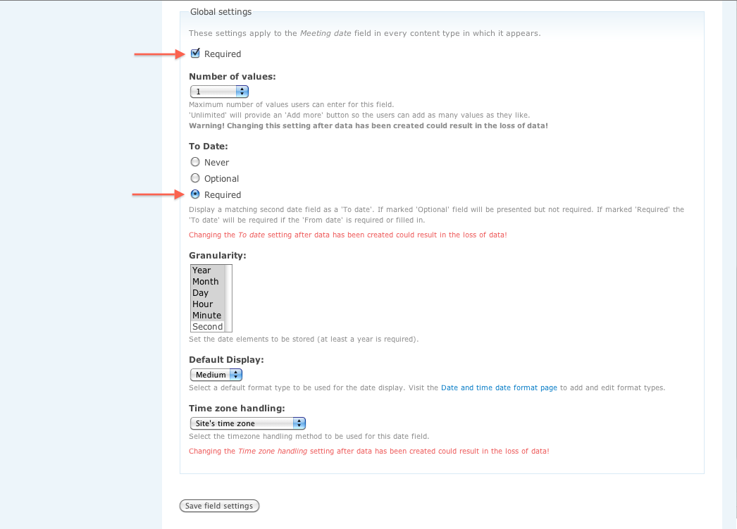 Once the basic field information has been entered, set the Required option for both the field itself and the To date. Without these settings, it's impossible for a resource to be scheduled for a finite period of time, and Resource Conflict will prevent you from enabling it for the content type.