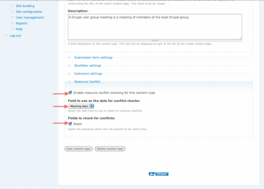 Now that the Meeting Date field has been created, go back to the main settings for the Drupal User Group Meeting content type. Now that all of the requirements for scheduling a resource has been met, Resource Conflict can be enabled. Check Enable resource conflict checking for this content type, select Meeting date to select the date field to check for conflicts, and check Room to indicate that Rooms can never be booked at the same time.