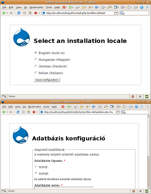 gábor hojtsyHere are two shots showing the locale selection (which shows the locales available for the profile) and the database setup screen after selecting the Hungarian locale.