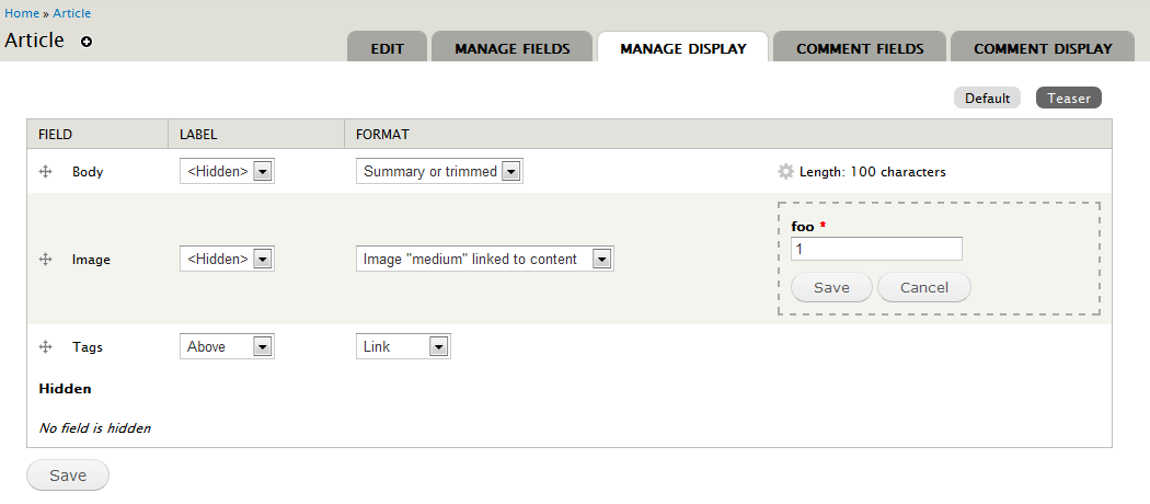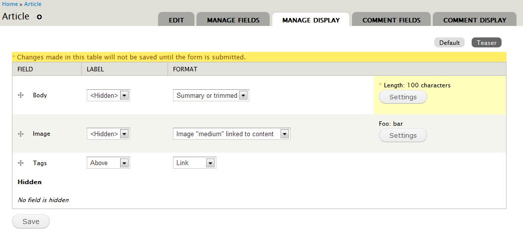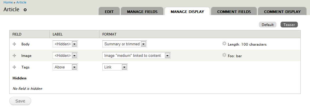 Best place to test is to go to admin/structure/types/manage/article/display/teaser