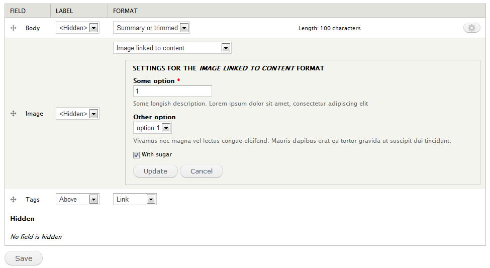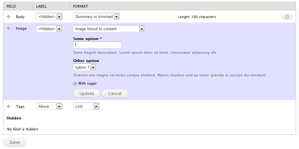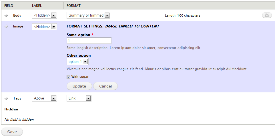 Bojhan commentedWhy don't we push these settings off to a separate page? Ie having a Formatter link alongside each field? Either way the interaction if you want to go down this road should be similar to that of content type [edit] interaction.