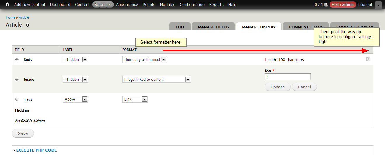 - when visually skimming over the 'Manage display' page, you need to be able to see which field uses which formatter, but also get a glimpse of the settings used for each formatter without having to click a link to open a separate form just to check the values. This calls for a notion of "settings summary", and has screen real-estate implications.
