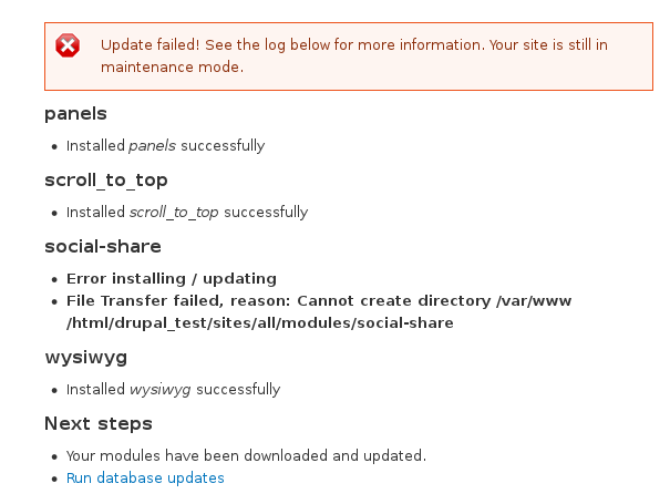 UpdateUploadTest::testUploadModule()to do the most minimal test possible. I think it fine that theUpdateUploadTest::testUploadModule()has more comprehensive testing of what it is doing. This new test adds coverage of things it does not test. @David_Rothstein I'd rather open a followup to address points 1 to 3 since I think a big refactor of UpdateUploadTest and testing what happens when the file owner and permission means you don't have to use FTP or SSH is out of scope here.Patch attached fixes point 4.