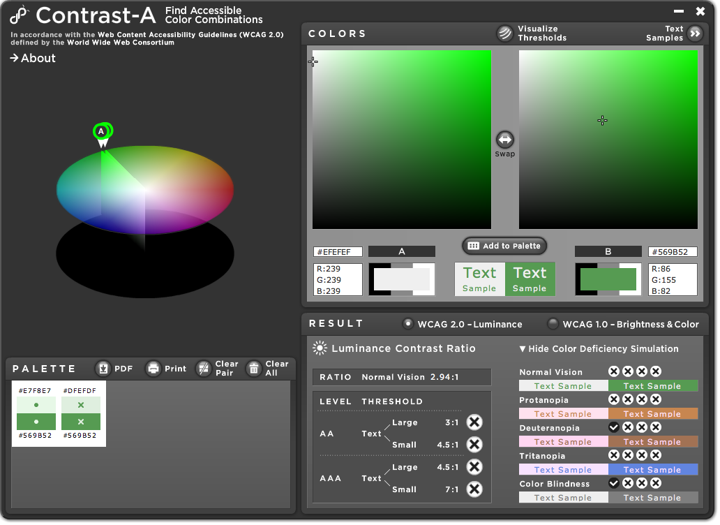 So although Vischeck gives those of us with normal color vision an idea of the visual experience for people with each form of colorblindness, it's not a measure of whether we've fully addressed the issues of color contrast. Contrast-A will simultaneously give you the ratios for each form of colorblindness as well as normal vision.