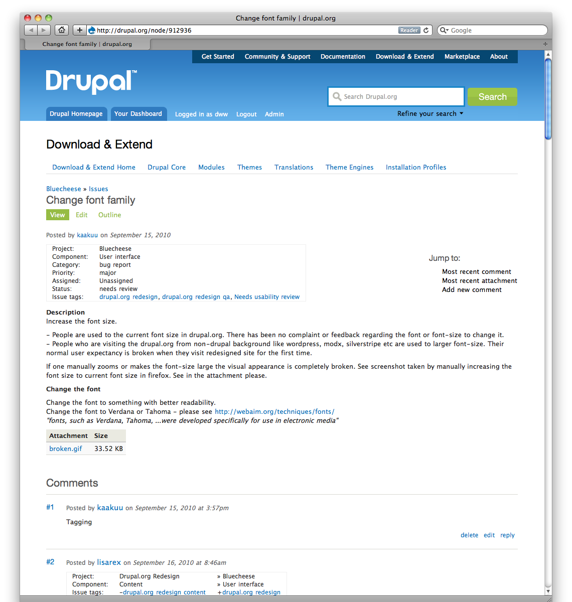 - People who are visiting the drupal.org from non-drupal background like wordpress, modx, silverstripe etc are used to larger font-size. Their normal user expectancy is broken when they visit redesigned site for the first time.
