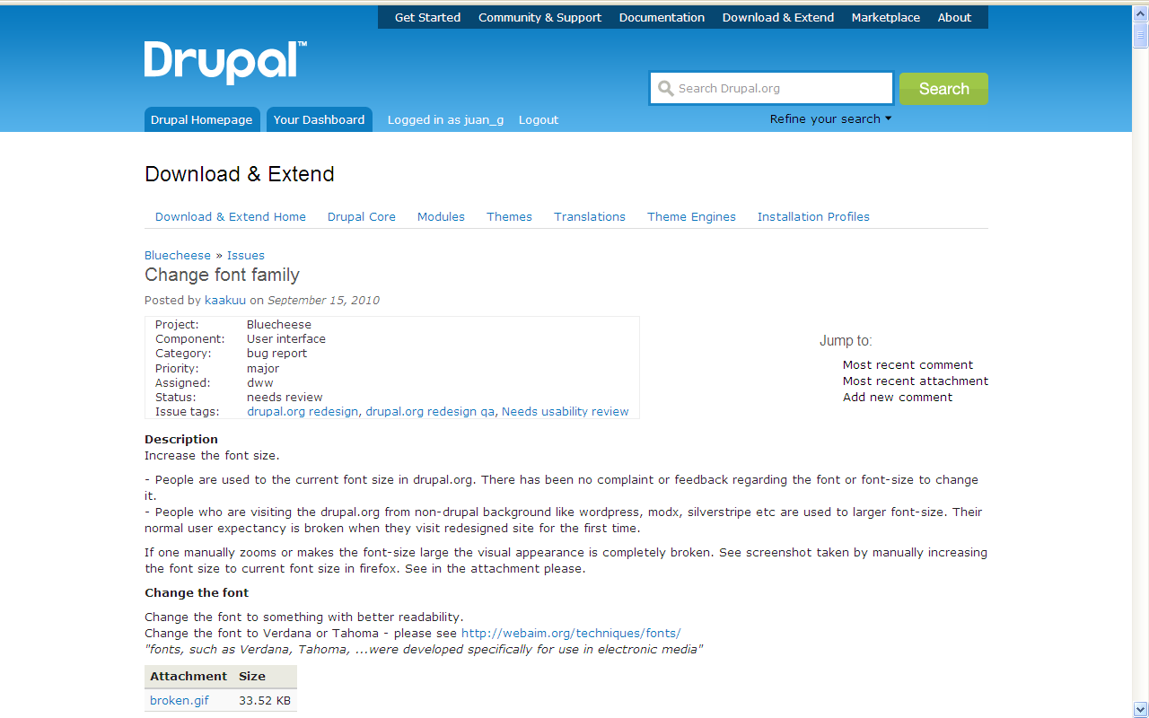 - People are used to the current font size in drupal.org. There has been no complaint or feedback regarding the font or font-size to change it.