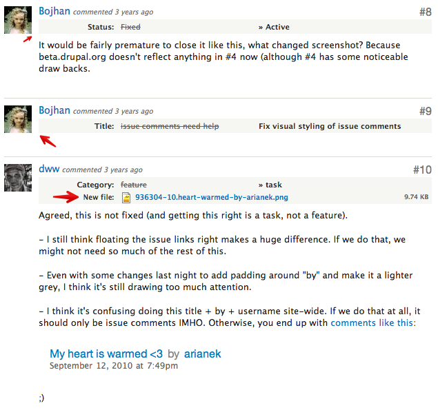 The issue queue seems completely unreadable after the redesign, as each comment just blends in with the next one. ATM, trying to read the queue hurts my eyes, and there are very few visual queues to let me know where one ends and the next one begins.