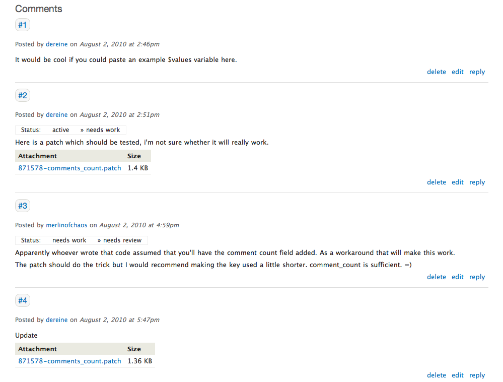 webchickActually, when I analyze my own behaviour on the current Drupal.org, what I look for for comment separation isn't the prominent border around the comments, it's the "#5" or whatever. It's big, and bold, and a different colour (black) from its surrounding elements (blue + grey). So maybe just restoring that colouring/styling would be enough?