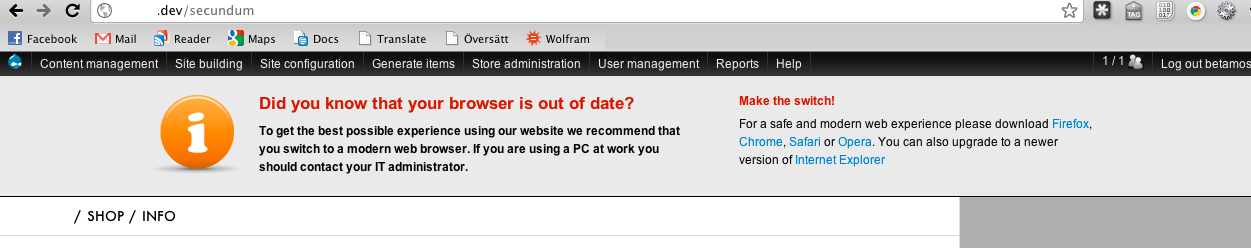 xamanu commentedWe'd have to change from the conditional comments (ie only) to js browser detection with the navigator object and run this against the list defined in the admin ui. The only tricky part i can see is that the config settings have to be given to a simple js-logic which decides if it should block the screen or not.