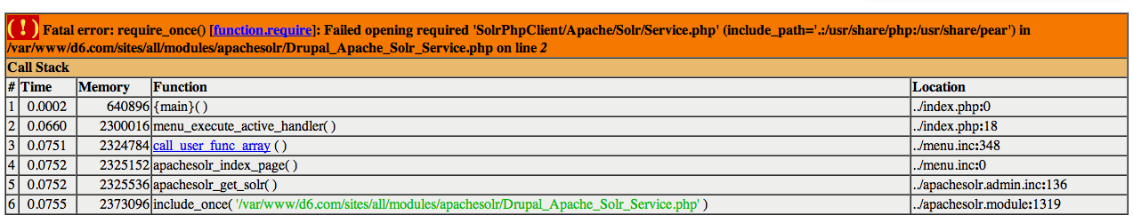 elliotttf commentedFatal error: require_once() [function.require]: Failed opening required 'SolrPhpClient/Apache/Solr/Service.php' (include_path='.:/usr/share/php:/usr/share/pear') in /var/www/d6.com/sites/all/modules/apachesolr/Drupal_Apache_Solr_Service.php on line 2
