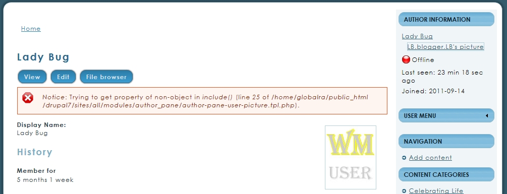 I allow my users at wisemusings.com to upload pictures of a certain size. It displays fine in the author pane for those users who upload their pictures. But for users who don't want to upload their pictures, I have a default picture for the which shows up fine in the user's account page and else where but it doesn't show up in author pane. More over, an ugly php error message shows up. I have attached a picture of it. Would be nice if this can be fixed. Thanks.