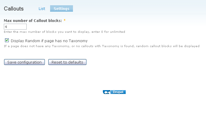 In the Admin section (at Admin > callouts) gives you the ability to choose the max number of callout blocks to display, as well as the option to turn on 'random' callouts. When random is enabled, if no callout nodes are found with related taxonomy terms as the page (or if the page does not have taxonomy terms) then the module will display random callout nodes (up to the set max).