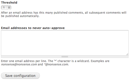 admin/content/comment/comment_trustto configure the module. - This module won't do anything if users have the "skip comment approval" permission; so, you'll probably want to disable that permission for the appropriate roles.