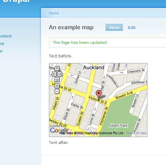 Just stick a simple div in the content with some special attributes and a Google Map will be displayed at that point. If you copy and paste examples. make sure Drupal's line break filter (enabled even for full HTML!) won't make the div invalid.
