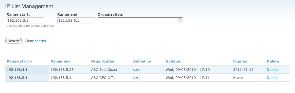 The IP List module allows administrators to maintain and search list of IP addresses and IP address ranges, and associate each address or range with an arbitrary organization (string). The module doesn't do anything with this list, but the list can be integrated into other systems.