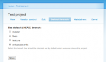 Depends on Project module and the Git versioncontrol backend. Adds a tab to the project page where maintainers that have access to the VCS can select a default branch.
