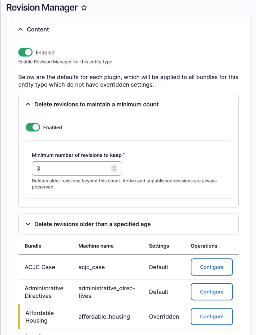 The Revision Manager module provides complete control over how revisions are retained and cleaned up across all revisionable entity types and bundles. Every policy and behavior is fully customizable, allowing you to preserve important content history while automatically removing outdated revisions. Whether you need to keep a minimum number of revisions, delete revisions older than a set age, or implement custom retention strategies, Revision Manager gives you full flexibility over revision management.